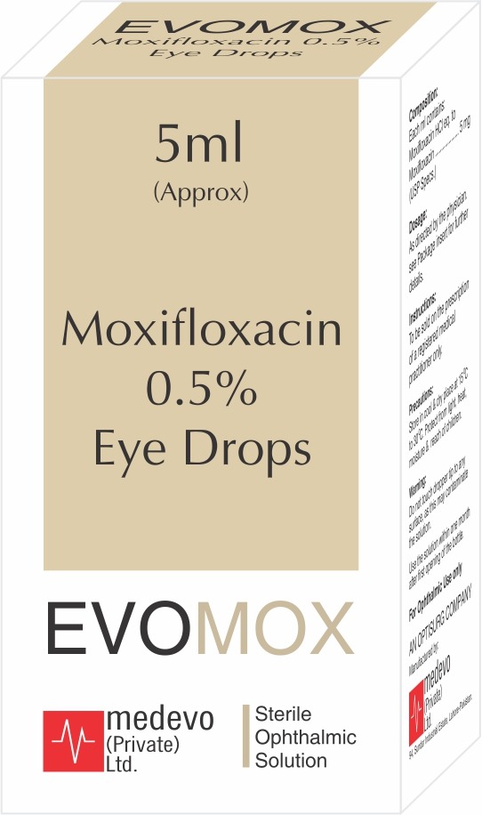 EVOMOX (moxifloxacin ophthalmic solution) 0.5% is supplied sterile in natural LDPE plastic bottle with dropper with tan high impact polystyrene (HIPS) cap in 5ml pack.