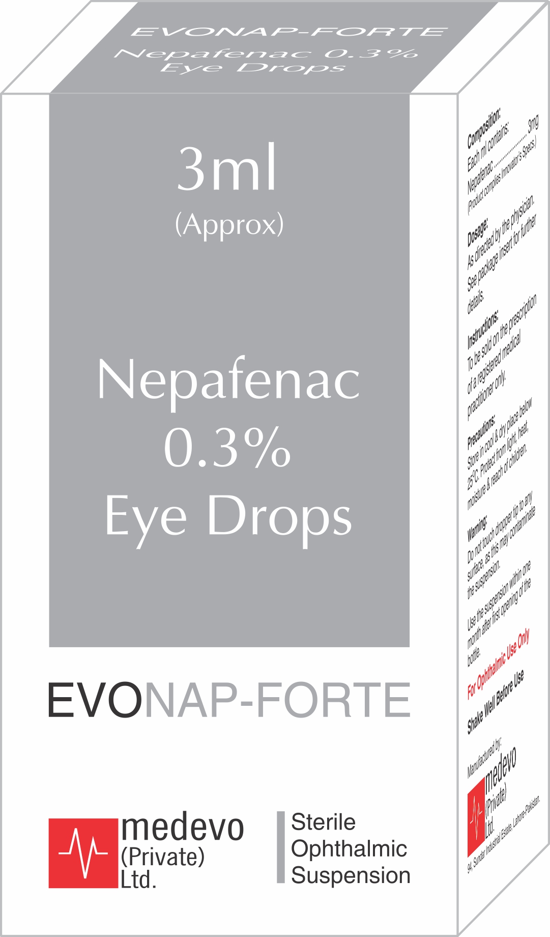 EVONAP-FORTE (nepafenac ophthalmic suspension) 0.3% is supplied sterile in natural LDPE plastic bottle with dropper with grey high impact polystyrene (HIPS) cap in 3ml pack.