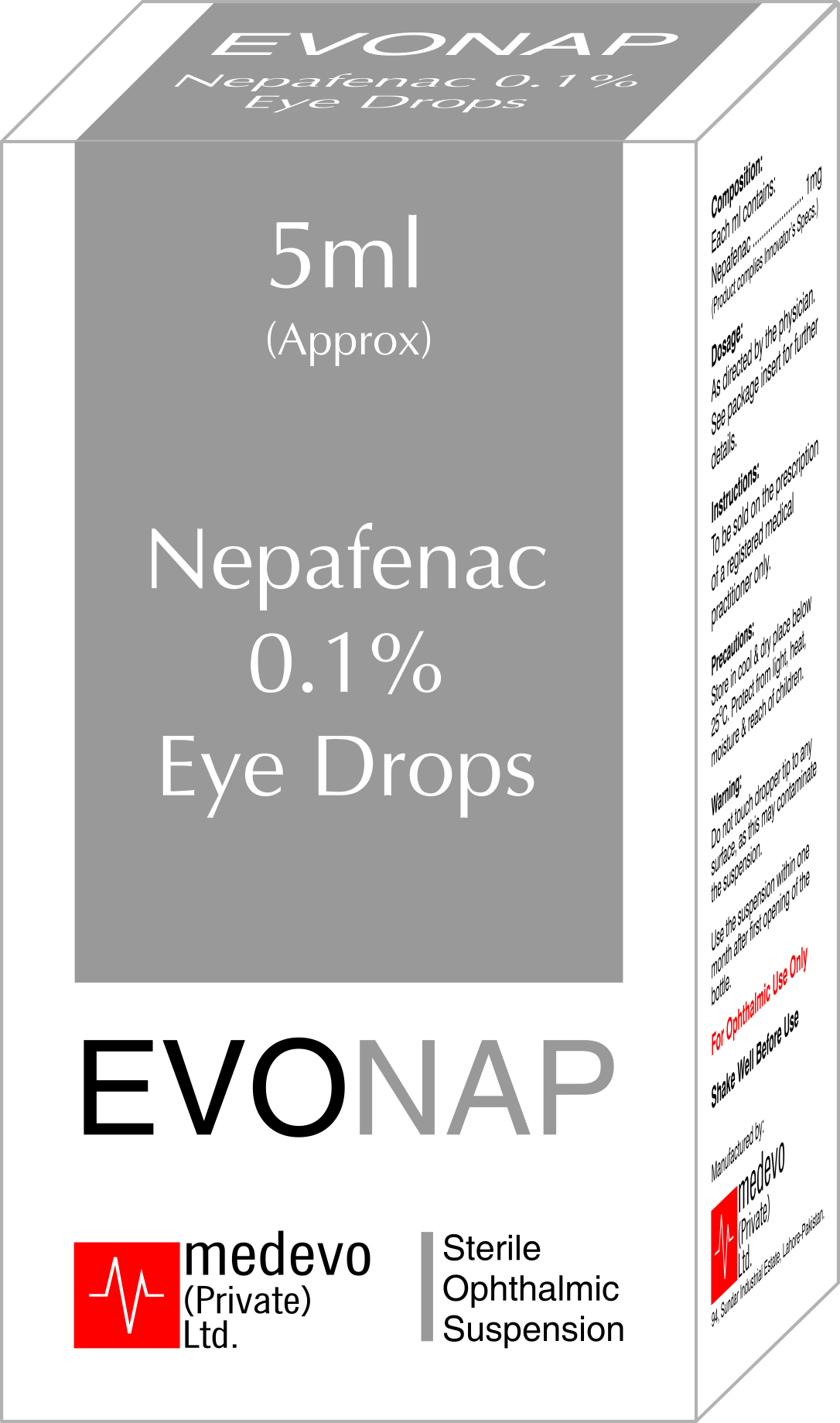 EVONAP (Nepafenac Ophthalmic Suspension 0.1%) is sterile, topical, ophthalmic, nonsteroidal anti-inflammatory (NSAID) prodrug for ophthalmic use.