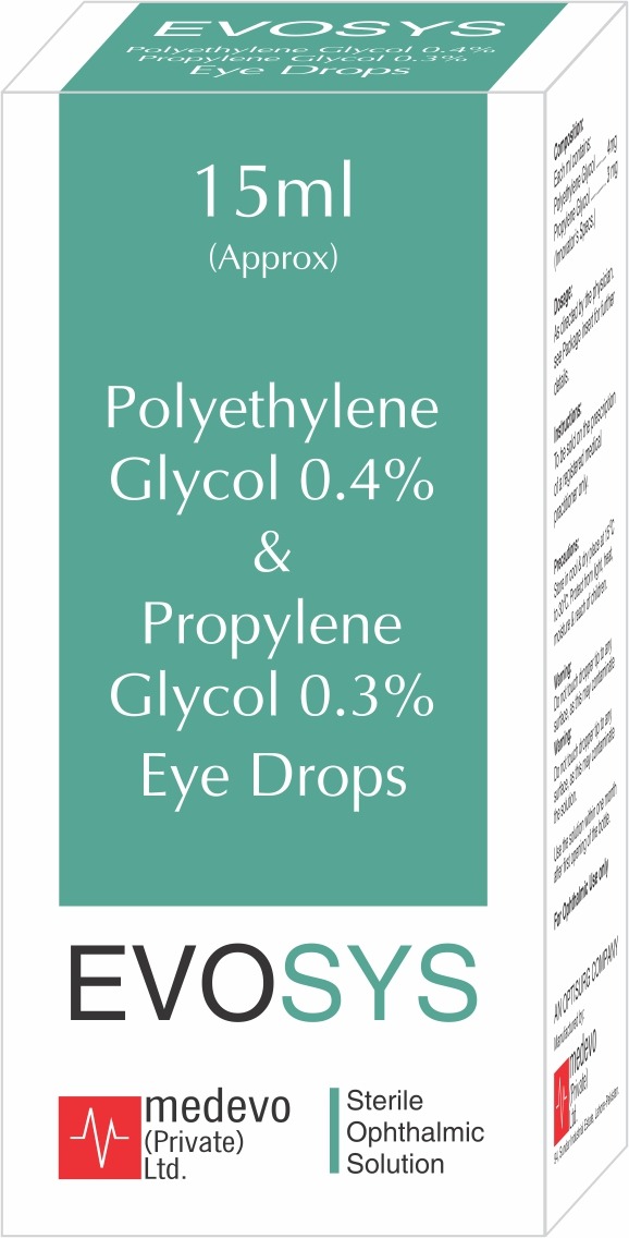 EVOSYS (Polyethylene Glycol 0.4% & Propylene Glycol 0.3%) is a sterile ophthalmic solution. It moisturizes the surface of your eyes for fast, long-lasting relief of the feelings of dryness, Irritation, burning, stinging, grittiness or foreign body sensation caused by environmental factors. Almost no side due to the used of Sodium Perborate (Oxidative Preservative) as preservative.