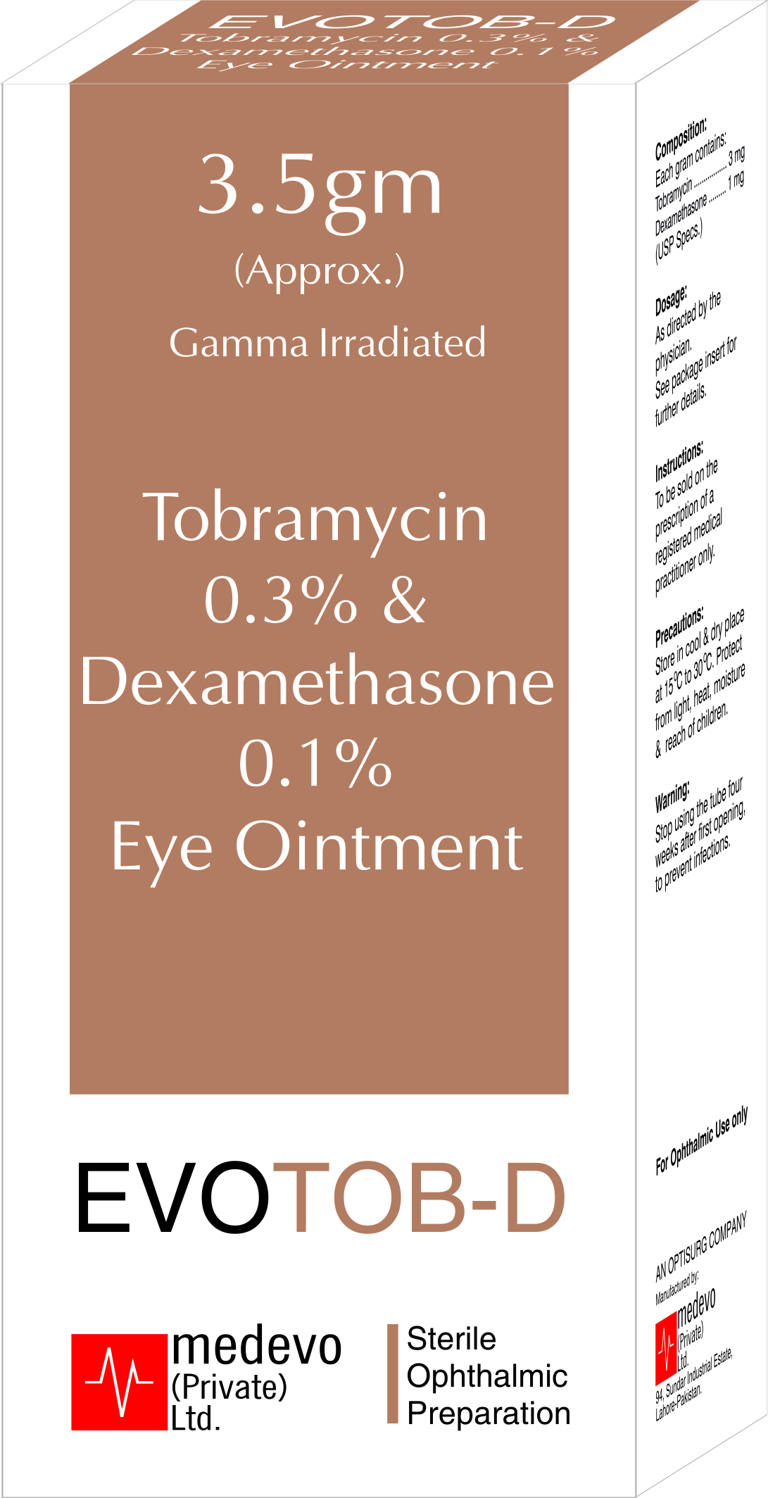 EVOTOB-D (Tobramycin 0.3% & Dexamethasone 0.1%) is sterile ophthalmic ointment. Corticoids suppress the inflammatory response to a variety of agents and they probably delay or slow healing. Since corticoids may inhibit the body's defense mechanism against infection, a concomitant antimicrobial drug may be used when this inhibition is considered to be clinically significant. Dexamethasone is a potent corticoid. The antibiotic component in the combination (Tobramycin) is included to provide action against susceptible strains of different microorganisms.