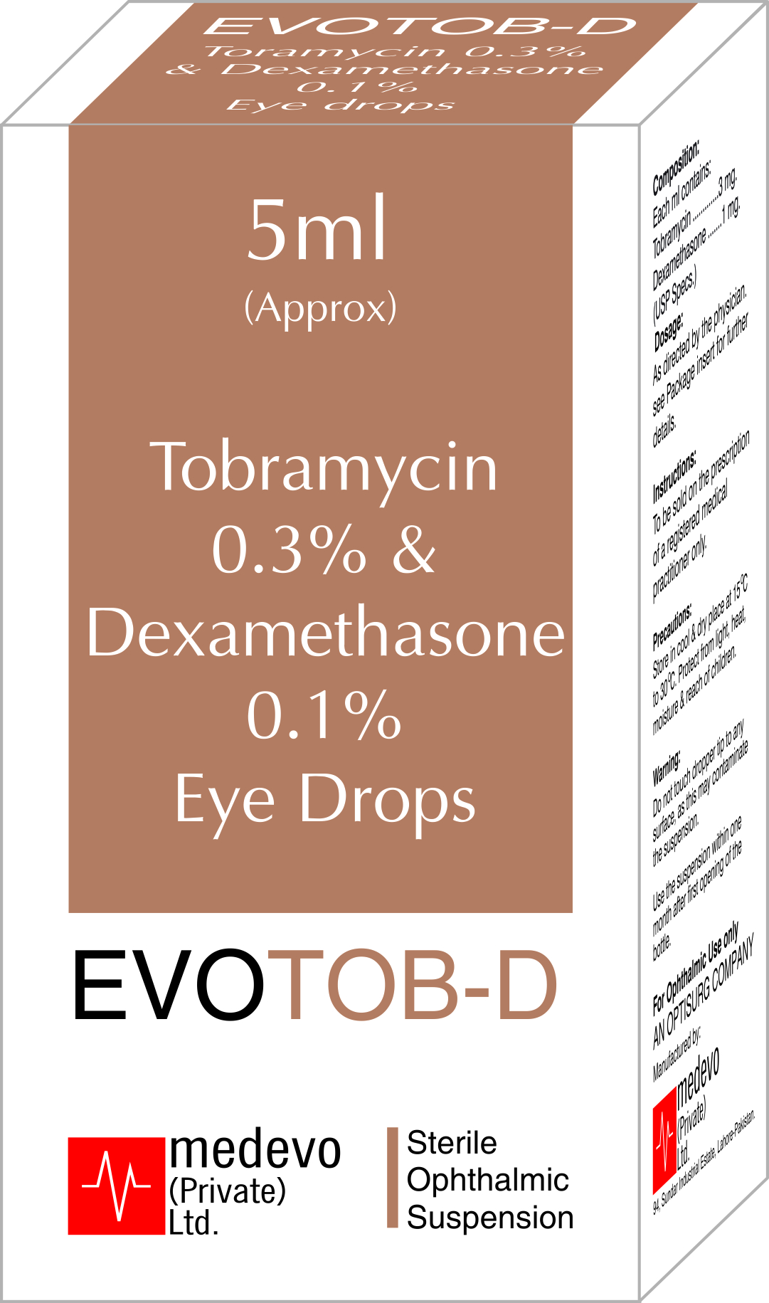 EVOTOB-D (combination of tobramycin 0.3% & dexamethasone 0.1% ophthalmic suspension) is supplied sterile in opaque white LDPE plastic bottle with dropper with white high impact polystyrene (HIPS) cap in 5ml pack.