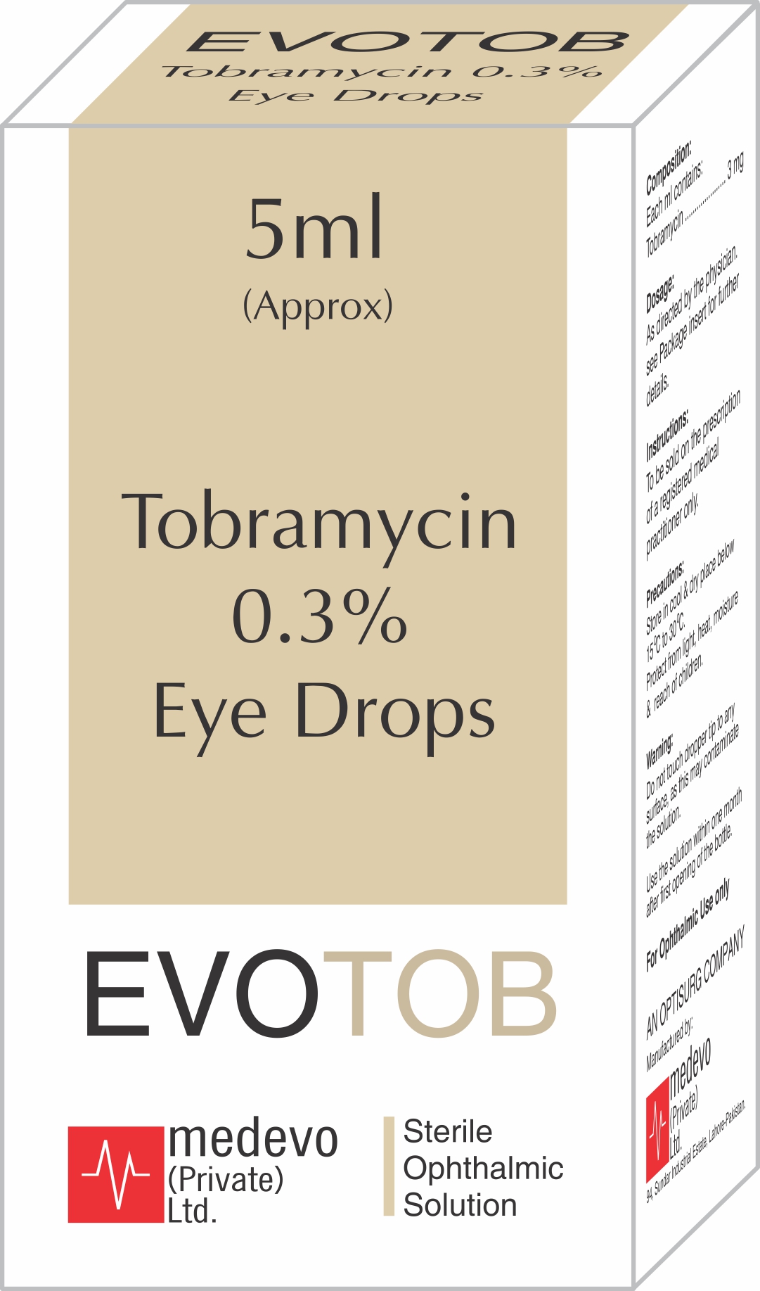 EVOTOB (tobramycin ophthalmic solution) 0.3% is supplied sterile in opaque white LDPE plastic bottle with dropper with tan high impact polystyrene (HIPS) cap in 5ml pack.