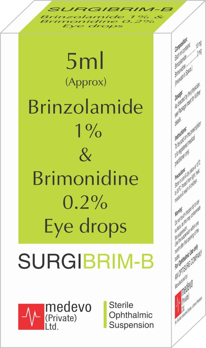 SURGIBRIM-B® (Brinzolamide + Brimonidine Tartrate) ophthalmic suspension 10mg + 2mg is a sterile, topical, combination of carbonic anhydrase inhibitors & alpha-2 adrenergic receptor agonists for ophthalmic use. SURGIBRIM-B is supplied as a sterile, off-white to yellowish color suspension.