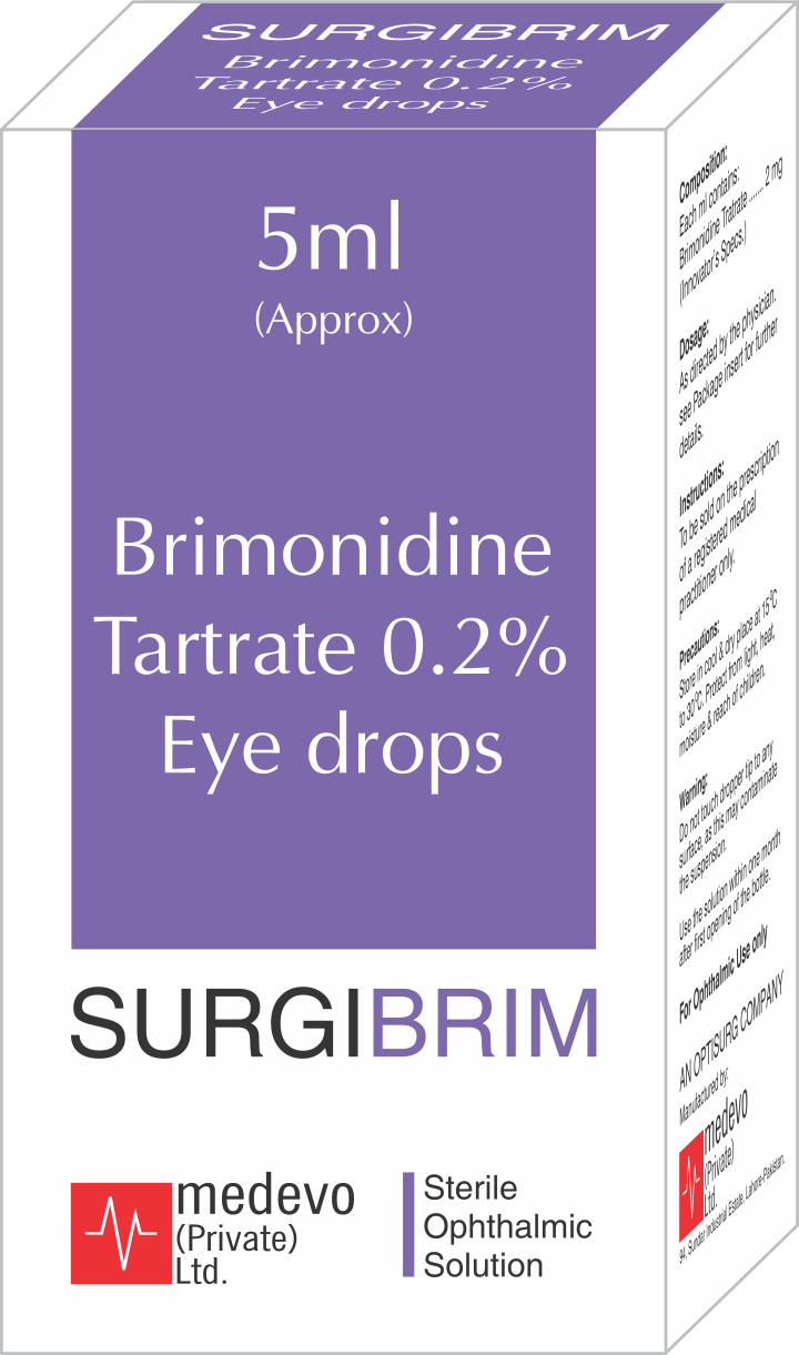 SURGIBRIM® (Brimonidine tartrate 0.2%) is a sterile ophthalmic solution. SURGIBRIM® is used for reduction of elevated intraocular pressure (IOP) in patients with open angle glaucoma or ocular hypertension. As monotherapy in patients in whom topical beta-blocker therapy is contraindicated and as adjunctive therapy to other intraocular pressure lowering medications when the target intraocular pressure is not achieved with a single agent.