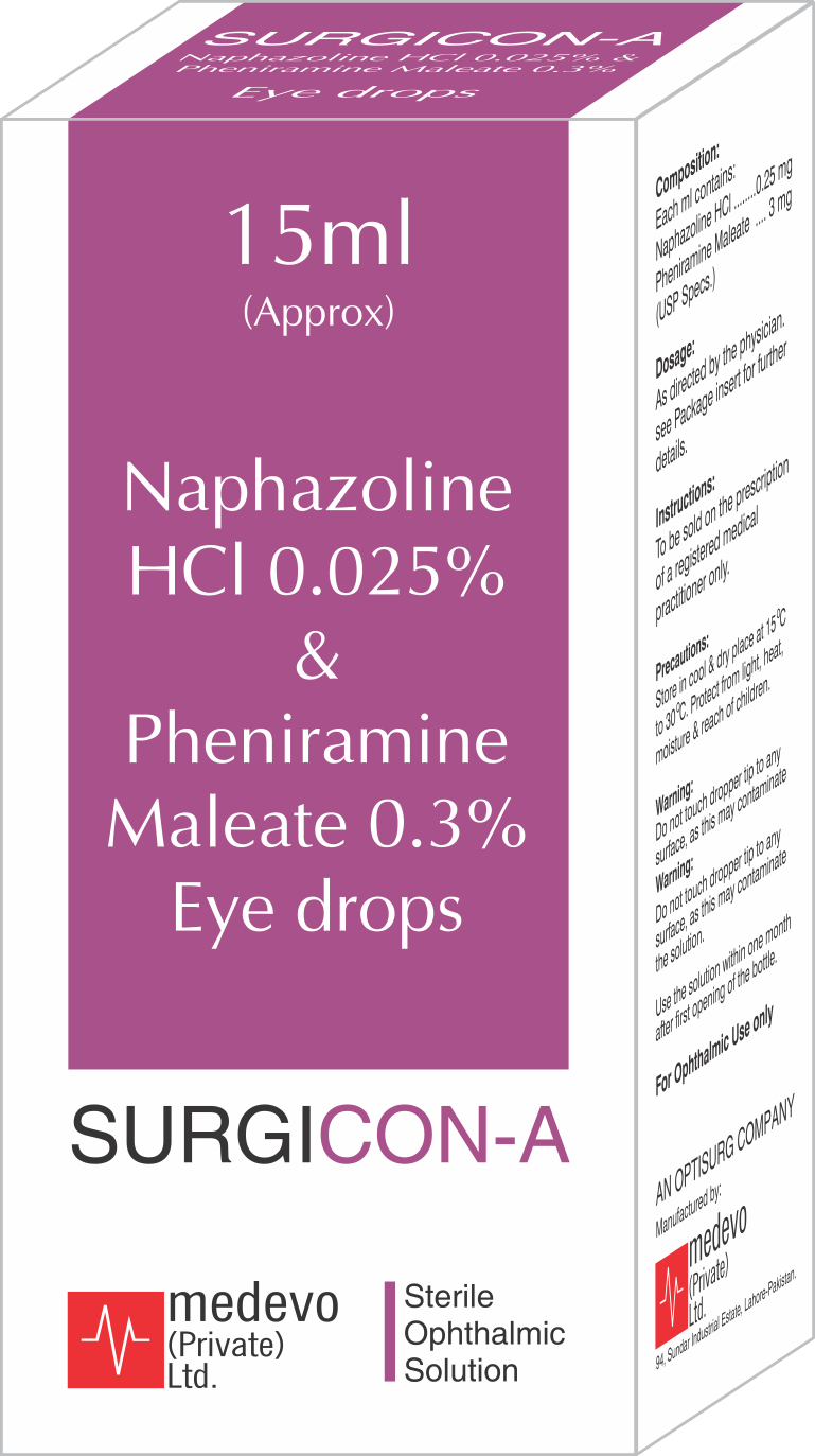 SURGICON-A® (naphazoline hydrochloride 0.025% & pheniramine maleate 0.3% ophthalmic solution) is supplied sterile in natural LDPE plastic bottle with dropper with white high impact polystyrene (HIPS) cap in 15ml pack.