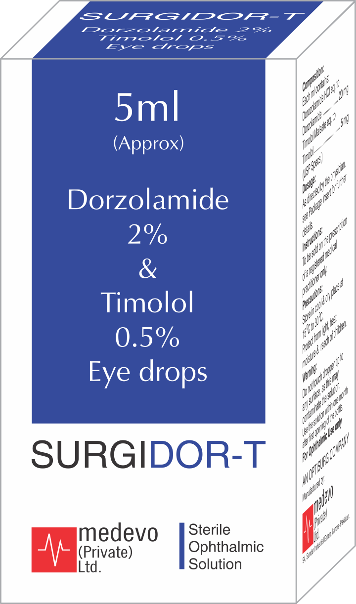 SURGIDOR-T® (Timolol maleate- Dorzolamide hydrochloride ophthalmic solution) is the combination of a topical carbonic anhydrase inhibitor and a topical beta-adrenergic receptor blocking agent. SURGIDOR-T is supplied as a sterile, isotonic, buffered, slightly viscous, aqueous solution. The PH of the solution is approximately 6.8. Each ml of SURGIDOR-T contains 20mg Dorzolamide & 5mg Timolol.