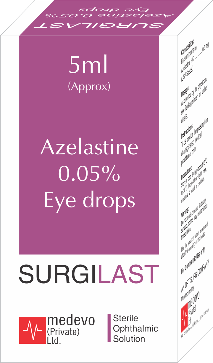 SURGILAST® (Azelastine Hydrochloride 0.05%) is a sterile ophthalmic solution Azelastine hydrochloride is a relatively selective histamine H1 antagonist and an inhibitor of the release of histamine and other mediators from cells (e.q. mast cells) involved in the allergic response. Based on in-vitro studies using human cell lines, inhibition of other mediators involved in allergic reactions (e.g. leukotrienes and PAF) has been demonstrated with azelastine hydrochloride. Decreased chemotaxis and activation of eosinophils has also been demonstrated.
