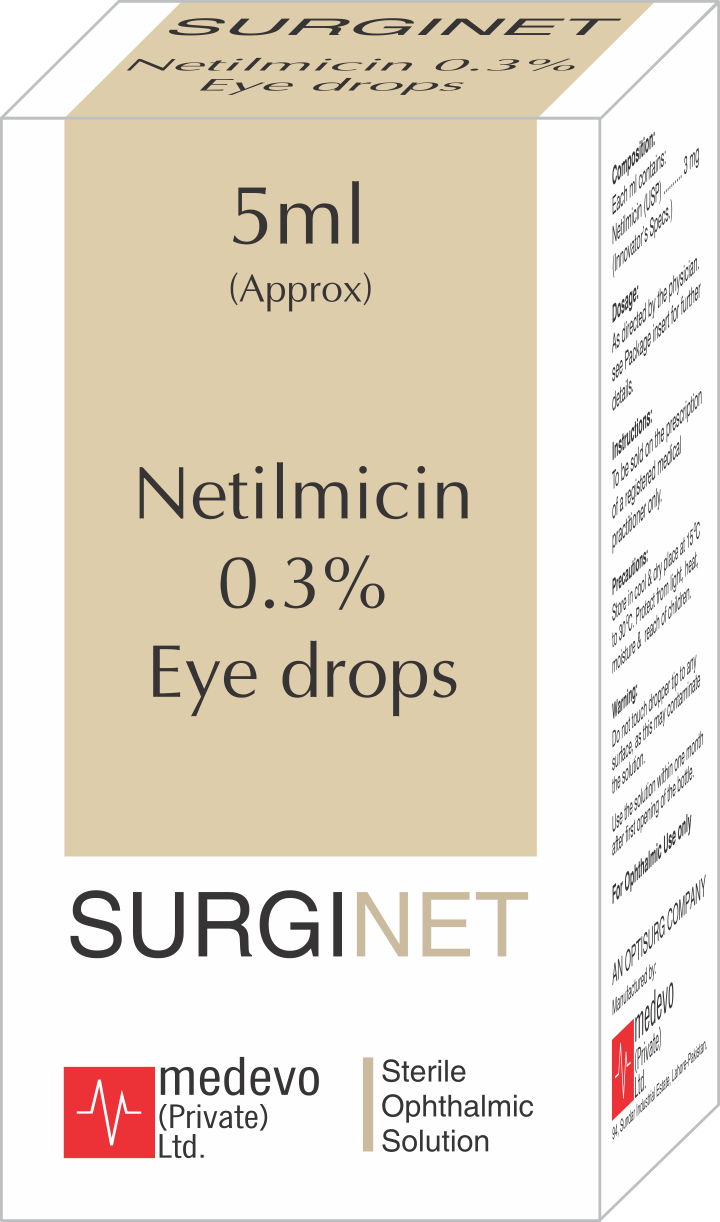 SURGINET® (Netilmicin 0.3%) is a sterile ophthalmic solution. Netilmicin is an aminoglycoside antibiotic. Topical treatment of external infections of the eye and its adnexa caused by germs sensitive to Netilmicin, including those producing adenylating or phosphorylating enzymes.